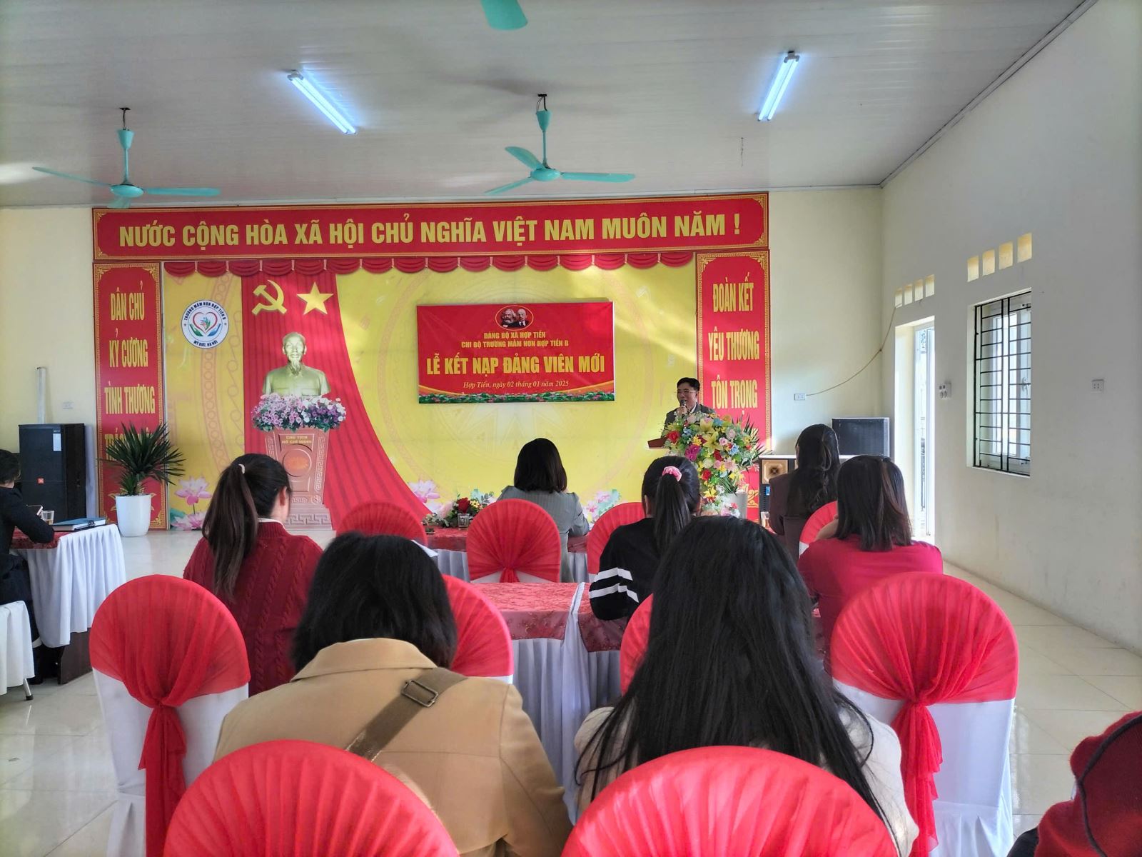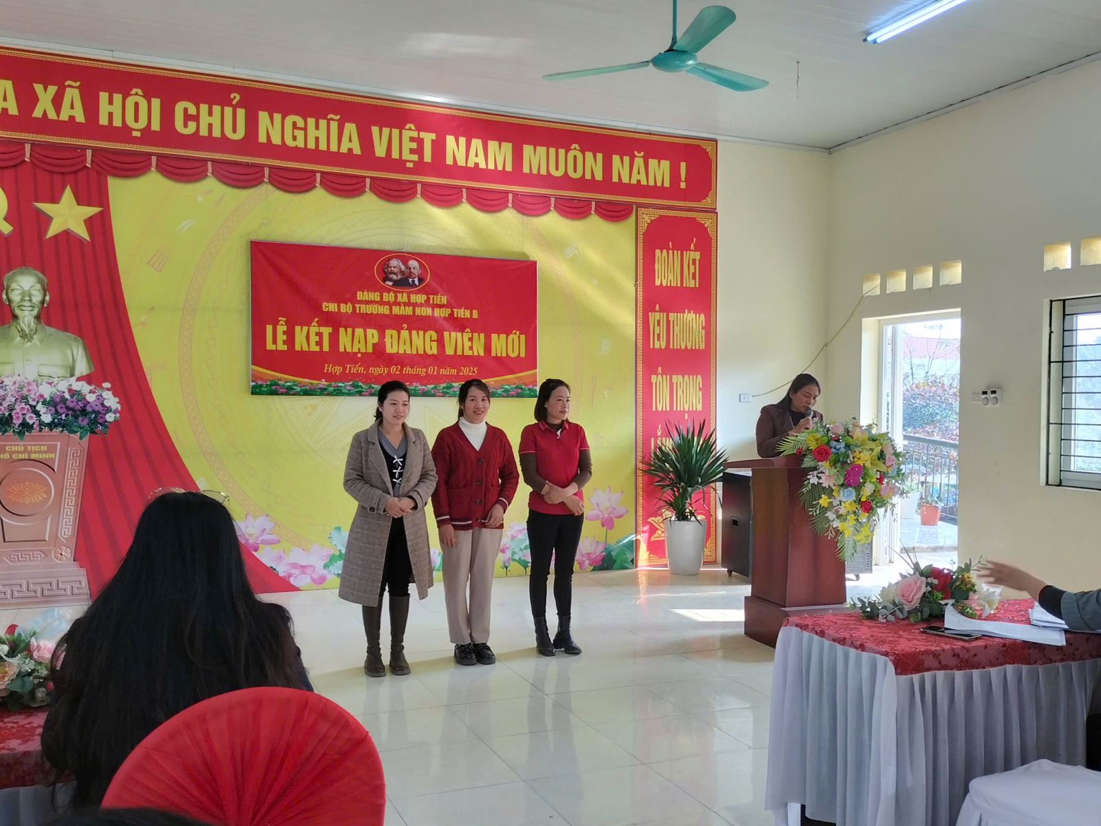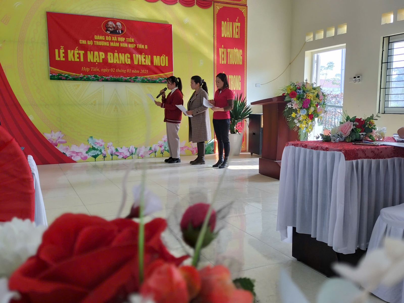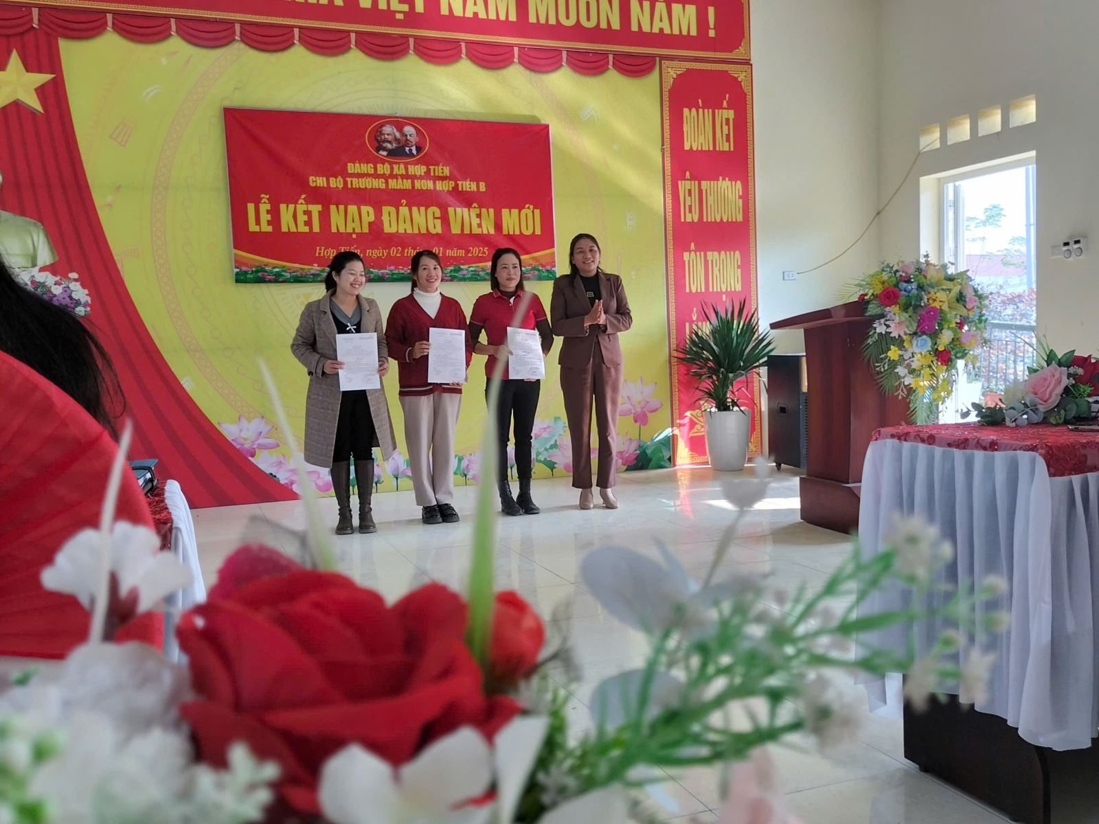 Thực hiện Nghị quyết Đại hội Chi bộ Trường Mầm Non Hợp Tiến B về việc phát triển Đảng viên. Ngày 2/1/2025, Chi bộ trường Trường Mầm Non Hợp Tiến B đã long trọng tổ chức lễ kết nạp Đảng viên mới đối với 3 quần chúng ưu tú. Đây là sự kiện có ý nghĩa quan trọng trong công tác xây dựng Đảng, góp phần phát triển, nâng cao chất lượng và sức chiến đấu của Chi bộ trường nói chung và các cá nhân Đảng viên nói riêng.