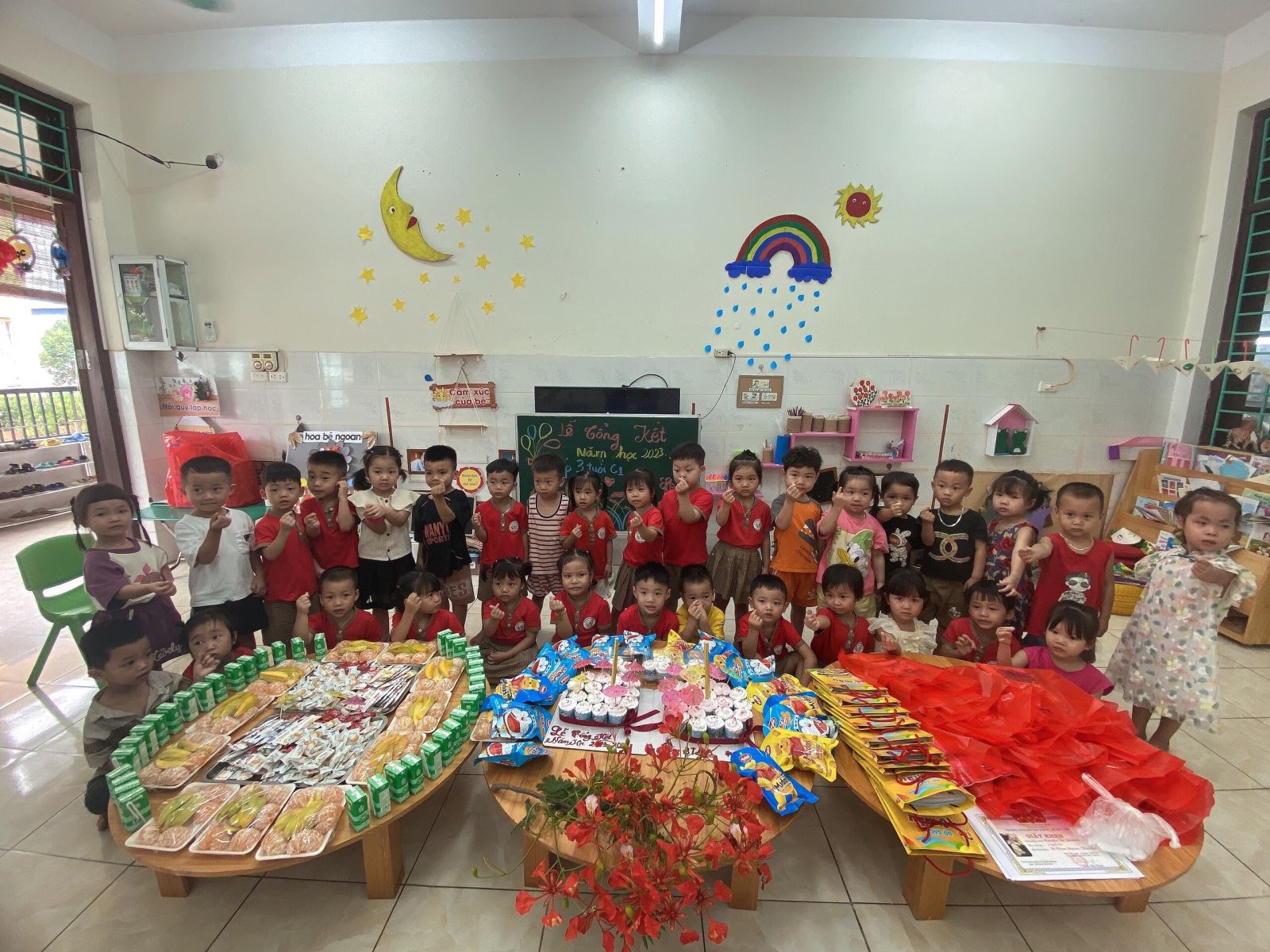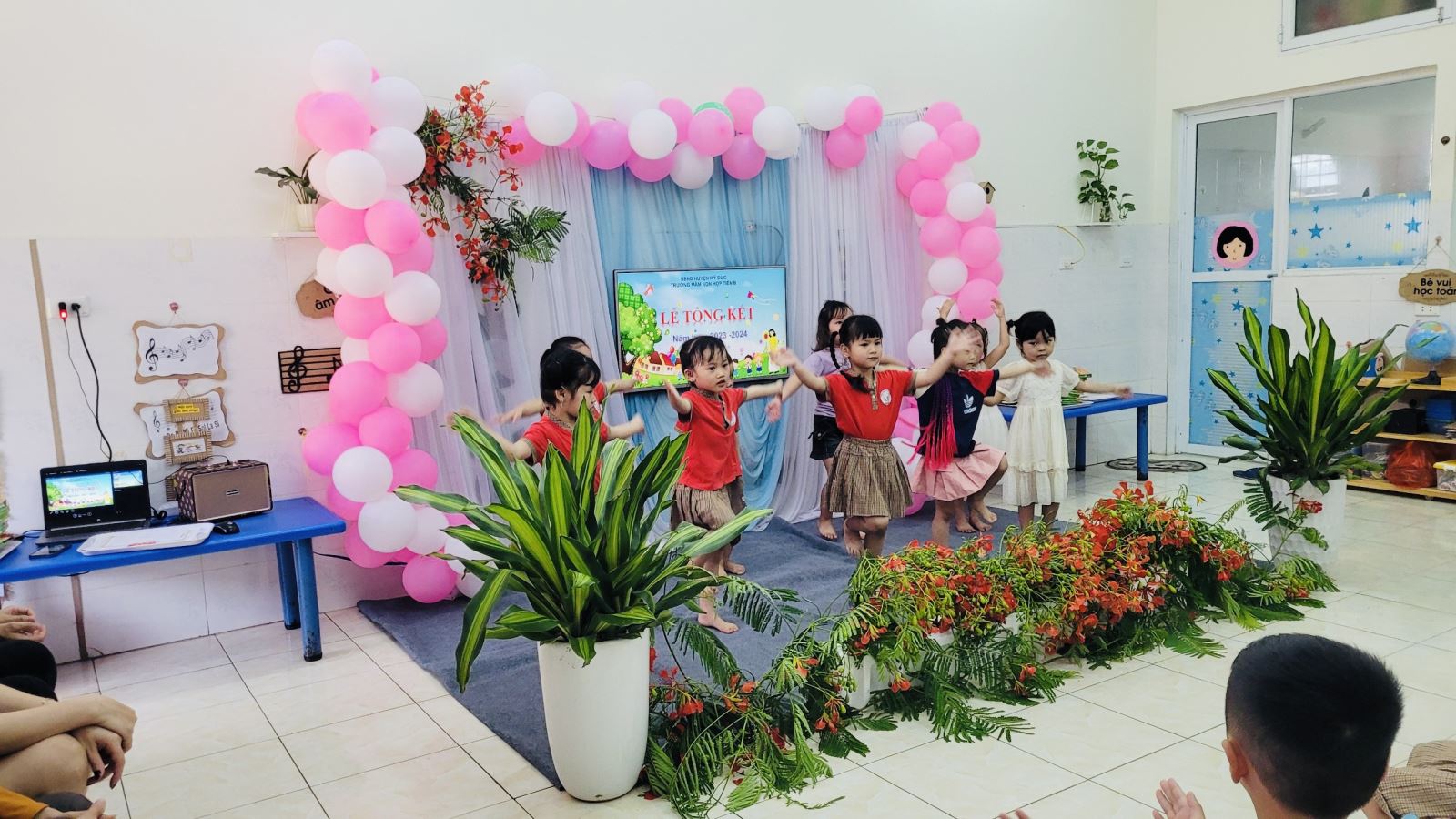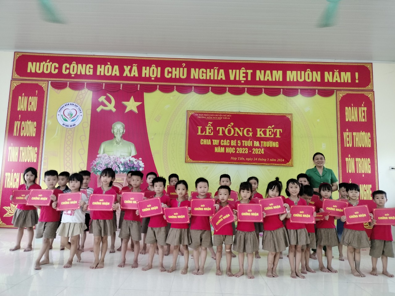 24/05/2024 A- A A+ | TỔNG KẾT NĂM HỌC 2023 -2024 CÔ TRÒ TRƯỜNG MẦM NON HỢP TIẾN B Xem Chia s? Ngày 24/5/2024 Trường mầm non Hợp Tiến B tổ chức Lễ tổng kết năm học 2023-2024 chia tay các bé 5 tuổi Một năm học 2023 – 2024 đang khép lại, tiếng ve kêu râm ran là những cánh hoa phượng nở đỏ rực cả một góc trời đó là lúc các cô giáo nhìn lại những thành quả của mình sau một năm học. Những ngày đầu các cháu mầm non mới bỡ ngỡ bước vào trường cùng những ánh mắt ngây thơ hồn nhiên, trải qua 1 năm học cùng các cô, giờ đây là thời khắc kết thúc năm học.. Hè về, cũng là lúc các bạn lớp mẫu giáo 5 - 6 tuổi chia tay với trường, với lớp, với cô, với bạn để bước sang một môi trường mới. Các con 5 - 6 tuổi sẽ tạm biệt mái trường mầm non thân thương, nơi các con đã được bàn tay yêu thương chăm sóc, dạy dỗ, nơi đã ghi lại nhiều kỷ niệm tuổi thơ êm đềm. Thời gian cứ lặng lẽ trôi, nhớ lại ngày nào các con bước vào lớp với bao bỡ ngỡ, lạ cô, lạ bạn, có những tiếng khóc và hơn hết là cả những tiếng cười, niềm vui.... giờ các con đã quen cô, quen bạn và học được bao điều thú vị từ chương trình học của nhà trường. Cùng với đó là những ngày hội các con được trải nghiệm thực tế, phát triển những kỹ năng cũng như tư duy sáng tạo của bản thân. Các con đã có sự thay đổi lớn khôn, hòa đồng và tự tin hơn, tất cả đều đầy ắp niềm vui và những điều bổ ích. Một năm học là khoảng thời gian không quá dài nhưng cũng đủ khắc ghi lại biết bao kỷ niệm đẹp của cô và trò. Trong năm học vừa qua, cô và trò Trường Mầm non Hợp Tiến B đã đạt được những thành tích đáng tự hào, góp phần vào thành công chung của nhà trường. Các cô giáo đã nỗ lực không ngừng trong chăm sóc, nuôi dạy các con và có nhiều đổi mới sáng tạo trong tổ chức các hoạt động giáo dục. Và để có được thành công đó không thể không kể đến sự động viên kịp thời, hỗ trợ tích cực của các bậc cha mẹ học sinh đã luôn đồng hành cùng nhà trường. Buổi lễ tổng kết được diễn ra tại các lớp trong không khí vui tươi, hào hứng của các con. Một năm học đã kết thúc với đầy ắp tiếng cười và niềm vui của trẻ. Chúc tất cả các con có một kỳ nghỉ hè thật vui, thật bổ ích và lý thú. Chúc các cô có một sức khỏe tốt để tiếp tục cống hiến cho sự nghiệp trồng người. Chúc các bậc cha mẹ học sinh luôn hạnh phúc và luôn sẵn sàng đồng hành cùng nhà trường để chăm lo cho thế hệ tương lai của đất nước. Sau đây là một số hình ảnh tổng kết năm học 2023 – 2024 của 12 nhóm lớp Tập tin đính kèm Tải về